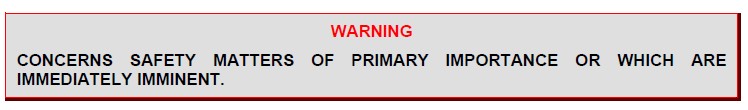 Concerns safety matters of secondary importance or which are not immediately imminent. ![]() CONCERNS SAFETY MATTERS OF PRIMARY IMPORTANCE OR WHICH ARE IMMEDIATELY IMMINENT. 在灣流手冊(cè)中,是這樣定義的:Warnings, Cautions and Notes: Used throughout this manual, these adjuncts highlight and emphasize certain points, and are not to be confused with Engine Instruments and Crew Alerting System (EICAS) messages. Shown below, each is explained in the style it will appear in this manual: ![]() CALLS ATTENTION TO THE USE OF MATERIALS, PROCESSES, METHODS, PROCEDURES OR LIMITS WHICH MUST BE PRECISELY FOLLOWED TO AVOID PERSONAL INJURY OR LOSS OF LIFE. |