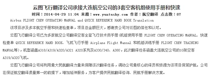 經(jīng)過對比,發(fā)現(xiàn)問題了吧,騙子公司云圖飛行翻譯網(wǎng)頁標(biāo)題里是大連航空公司的3套空客機(jī)組使用手冊,為何在新聞內(nèi)變成了10架?眾所周知,大連航空公司是沒有空客飛機(jī)的,只有波音737-800,大連航空公司和成都航空公司都是藍(lán)天飛行翻譯的客戶,客戶看了此新聞之后都發(fā)怒了,這種騙子公司復(fù)制藍(lán)天飛行翻譯公司網(wǎng)頁時候連腦筋都不動一下,新聞中間出現(xiàn)了藍(lán)天飛行翻譯公司已為多家航空公司翻譯空客手冊,有個A380,中國的A380只有南航有,而A380手冊是當(dāng)年藍(lán)天飛行翻譯公司翻譯的,這都是有合同的,這些都經(jīng)過深圳福田公證處公證,所以就算你們刪去也沒用,這些都是鐵證!