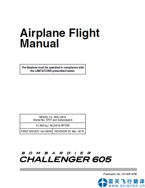 北京藍(lán)天飛行翻譯公司完成大型公務(wù)機(jī)公司的第32版/2015年3月18日版本龐巴迪挑戰(zhàn)者605全套飛行手冊翻譯任務(wù):第32版龐巴迪挑戰(zhàn)者605飛機(jī)飛行手冊、機(jī)組操作手冊、快速檢查單 Revision 32 Mar 18/15 Bombardier Challenger 605 Airplane Flight Manual, Flight Crew Operating Manual, Quick Reference Handbook Translation ![]() 龐巴迪挑戰(zhàn)者605飛機(jī)飛行手冊 Bombardier Challenger 605 Airplane Flight Manual ![]() 龐巴迪挑戰(zhàn)者605機(jī)組操作手冊第一冊 Bombardier Challenger 605 Flight Crew Operating Manual ![]() 龐巴迪挑戰(zhàn)者605機(jī)組操作手冊 Bombardier Challenger 605 Flight Crew Operating Manual ![]() 龐巴迪挑戰(zhàn)者605快速檢查單第一冊 Bombardier Challenger 605 Quick Reference Handbook ![]() 龐巴迪挑戰(zhàn)者605快速檢查單第二冊 Bombardier Challenger 605 Quick Reference Handbook |