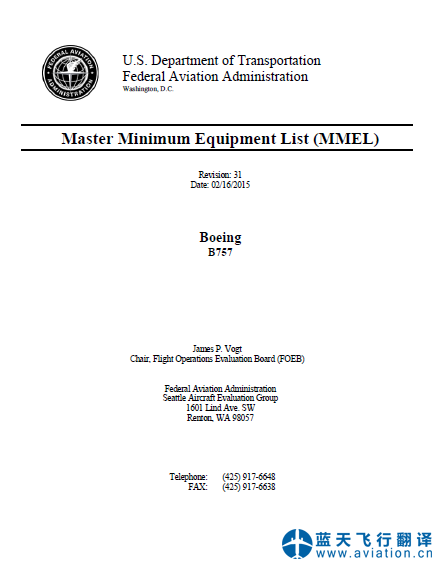 藍(lán)天飛行翻譯公司承接航空公司波音B757主最低設(shè)備清單翻譯任務(wù) Boeing B757 Master Minimum Equipment List (MMEL) Translation