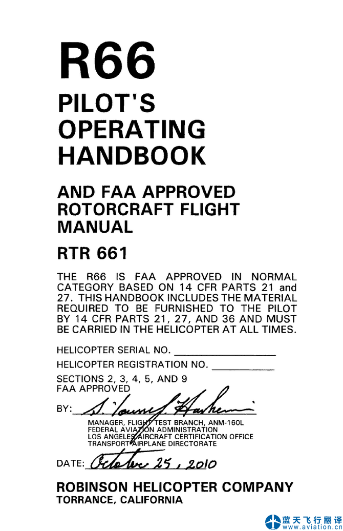 藍(lán)天飛行翻譯公司完成大型通用航空公司的羅賓遜R66飛行員操作手冊翻譯任務(wù) ROBINSON R66 Pilot's Operating Handbook Translation