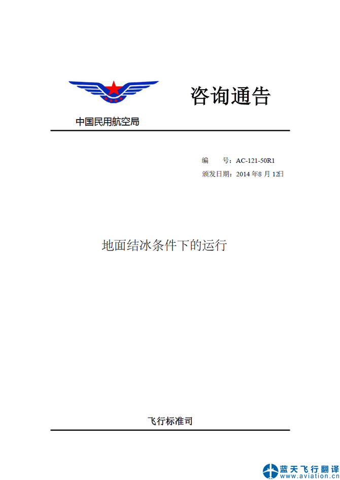 北京藍天飛行翻譯公司承接中國民用航空局飛行標準司地面結(jié)冰條件下的運行咨詢通告翻譯  CAAC Advisory Circular Translation: Ground Operation In Icing Conditions