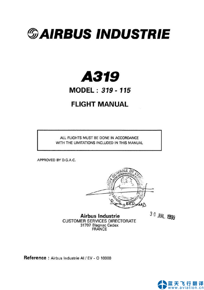 北京藍(lán)天飛行翻譯有限公司承接航空公司2017年12月12日版本空客A319-115飛機(jī)飛行手冊翻譯任務(wù) A319-115 AIRPLANE FLIGHT MANUAL Translation Issue date: 12 DEC 17
