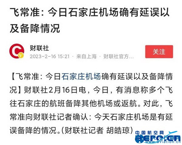 2月16日,有消息稱中午前后多個(gè)飛往石家莊的航班備降其他機(jī)場(chǎng)或返航。有網(wǎng)友稱是大霧原因,還有網(wǎng)友稱石家莊上空全部都是軍機(jī)。